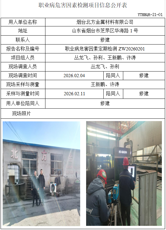 ZW20260201烟台北方金属材料有限公司职业病危害因素检测项目信息公开表(20260228)