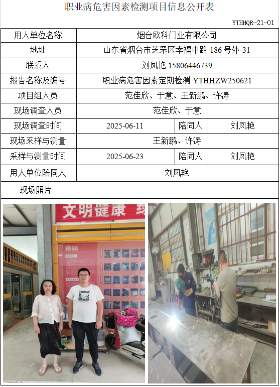 ZW20250621烟台欧科门业有限公司职业病危害因素检测项目信息公开表(20250725)