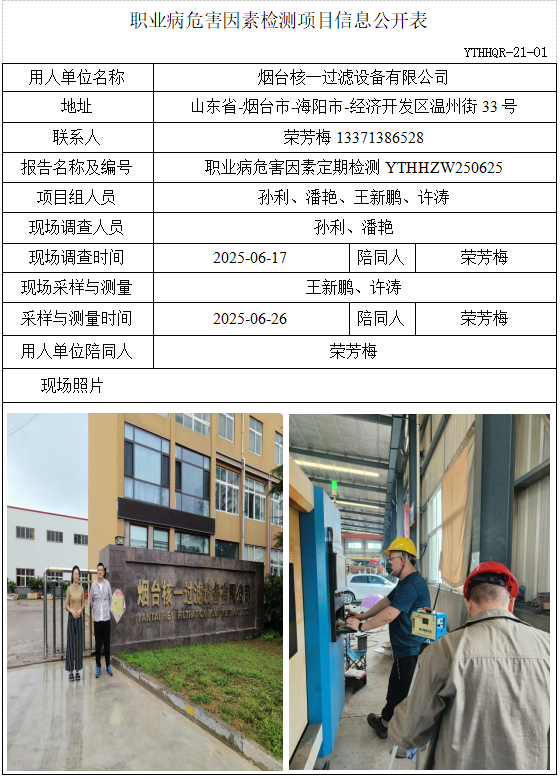 ZW20250625烟台核一过滤设备有限公司职业病危害因素检测项目信息公开表(20250723)
