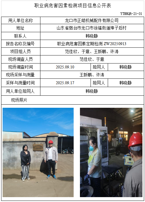 ZW20250913龙口市正皓机械配件有限公司职业病危害因素检测项目信息公开表(20251016)