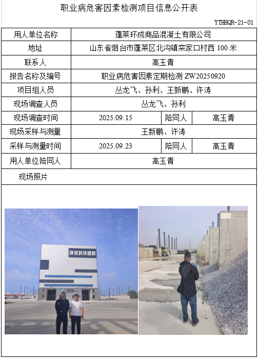 ZW20250920蓬莱环成商品混凝土有限公司职业病危害因素检测项目信息公开表(20251009)