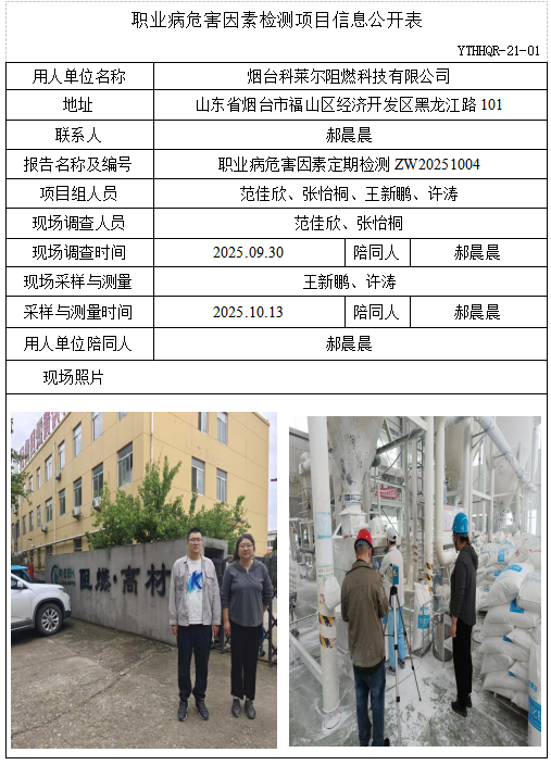 ZW20251004烟台科莱尔阻燃科技有限公司职业病危害因素检测项目信息公开表(20251028)
