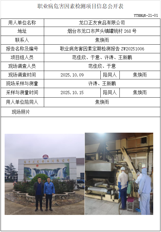 ZW20251006龙口正友食品有限公司职业病危害因素检测项目(20251101)